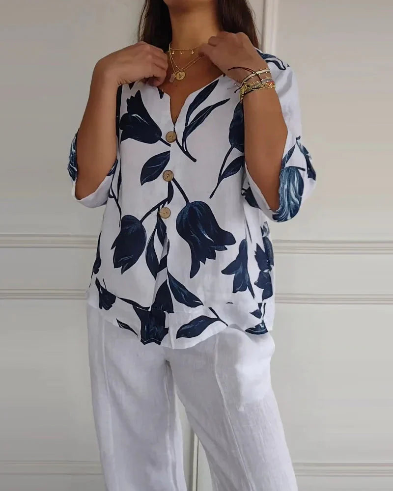 Discover the charm of our 'Blossom Breeze Cotton Top,' featuring a bold blue floral print that exudes casual elegance. Made with soft, breathable cotton, this top is styled with a flattering V-neck and breezy half sleeves, perfect for those warm, sunny days. Its loose fit ensures comfort, while the wooden button details add a touch of earthy sophistication. An essential piece for any summer wardrobe.