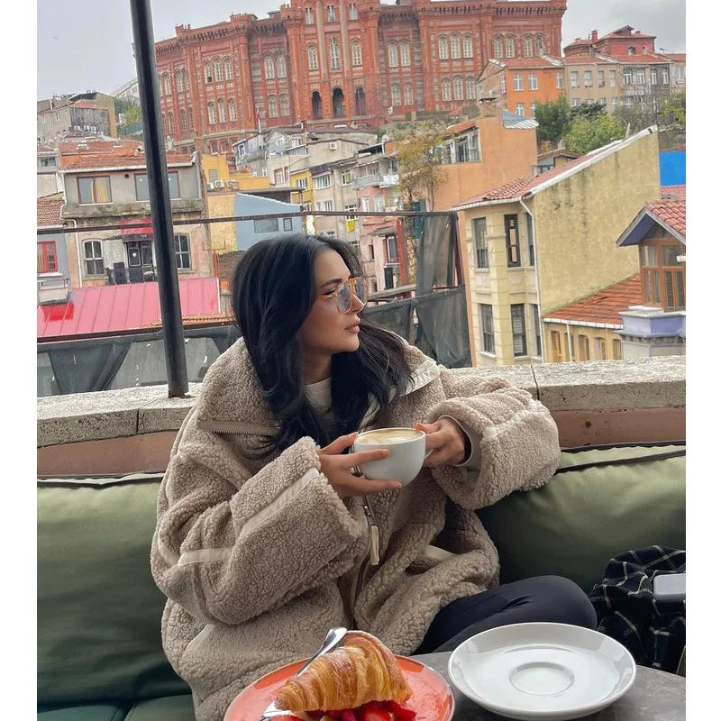 Complete your style with the Teddy Fleece Coat for women. This loose, oversized model with long sleeves, a stand-up collar, and trendy zip provides full comfort. A versatile addition to your wardrobe.